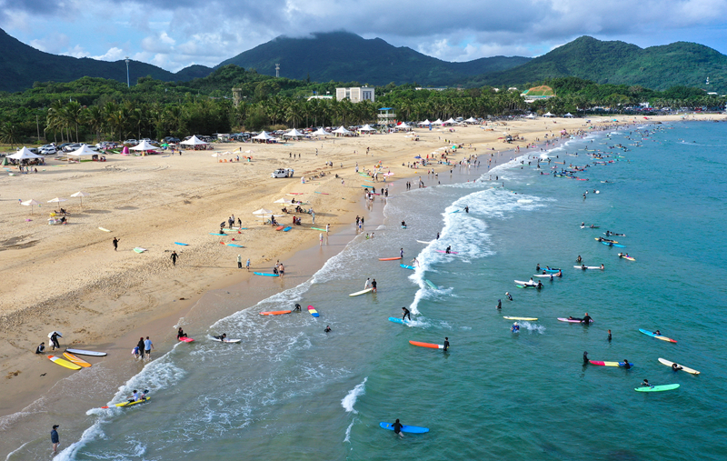 10月2日,游客在海南萬寧日月灣沖浪(無人機照片)。