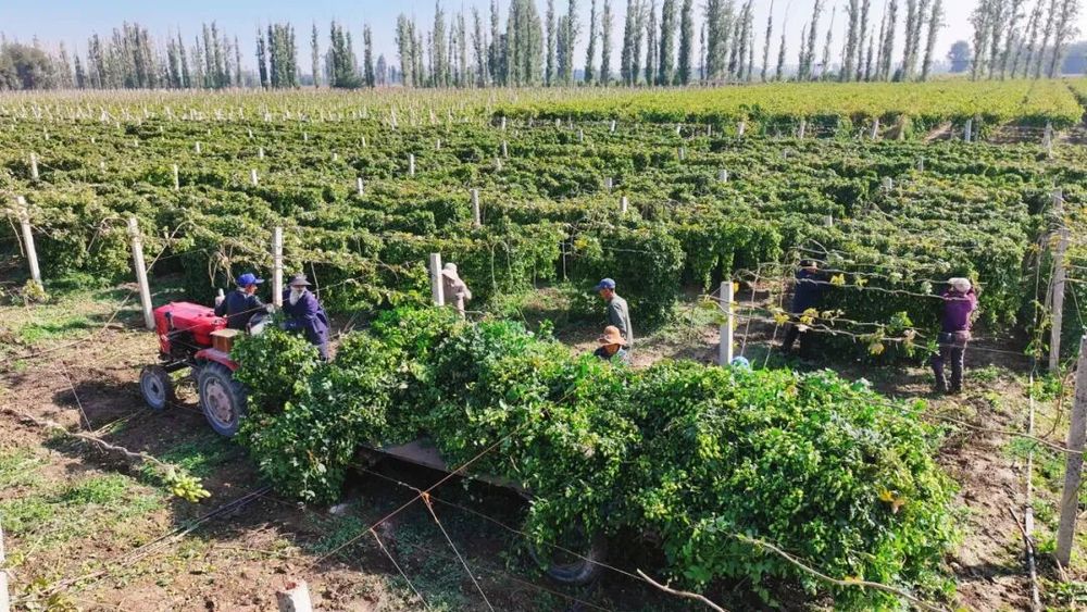 金秋時節(jié),新疆生產(chǎn)建設(shè)兵團(tuán)第八師石河子市142團(tuán)種植的6000畝啤酒花喜獲豐收,鮮花畝產(chǎn)量近1000公斤,烘干后干花達(dá)250公斤,每畝純收益約1500元。