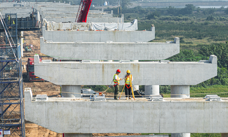 10月6日,在武漢都市圈環(huán)線高速公路孝感南段4標(biāo)項(xiàng)目上,中鐵二十局建設(shè)者進(jìn)行施工作業(yè)。