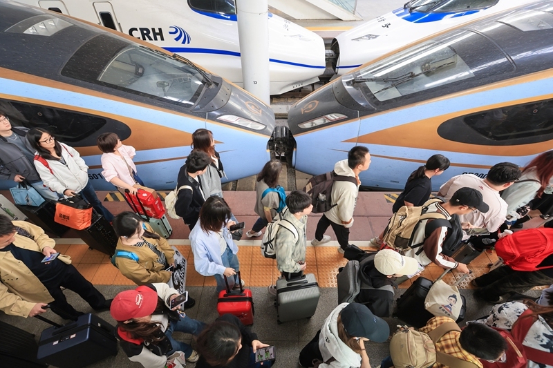 10月8日,旅客在江蘇無錫火車站站臺乘車。