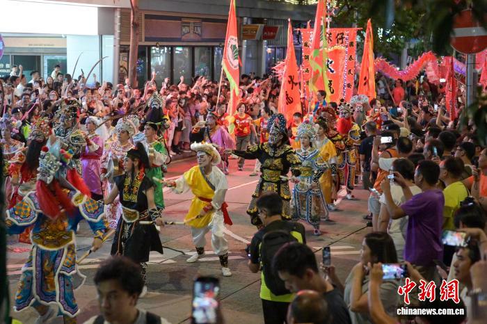 10月6日,中秋節(jié)當(dāng)晚,“香港仔中秋火龍盛會(huì)”在香港南區(qū)舉行,吸引民眾圍觀。圖為深圳市潮搏英歌隊(duì)在巡游隊(duì)伍中表演。 中新社記者 陳永諾 攝
