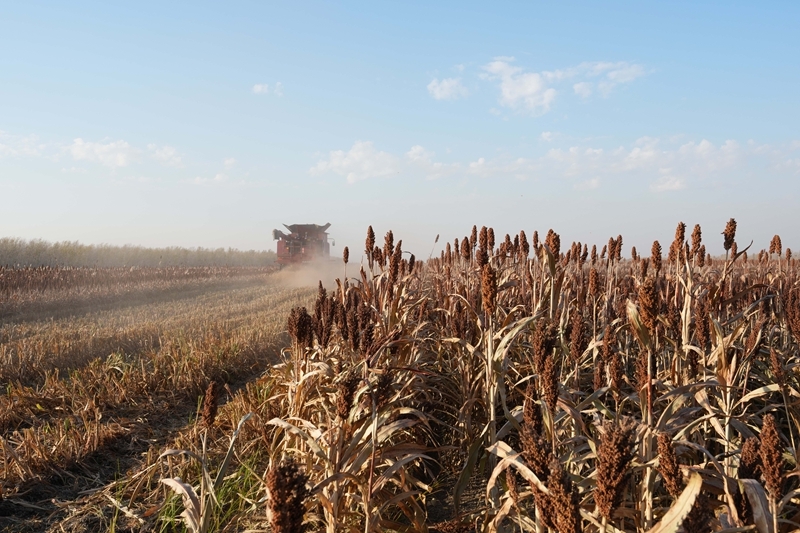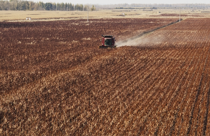 10月11日,在位于黑龍江省肇東市的北大荒集團四方山農(nóng)場有限公司,機械設備在進行高粱收獲作業(yè)。