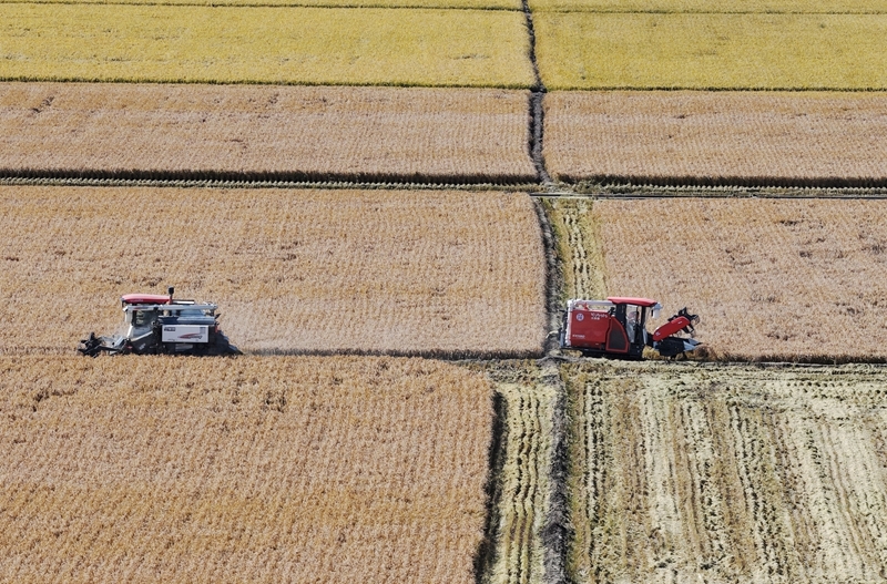 在位于黑龍江省雙鴨山市的北大荒集團友誼農(nóng)場有限公司,機械設備在進行水稻收獲作業(yè)(9月23日攝)。