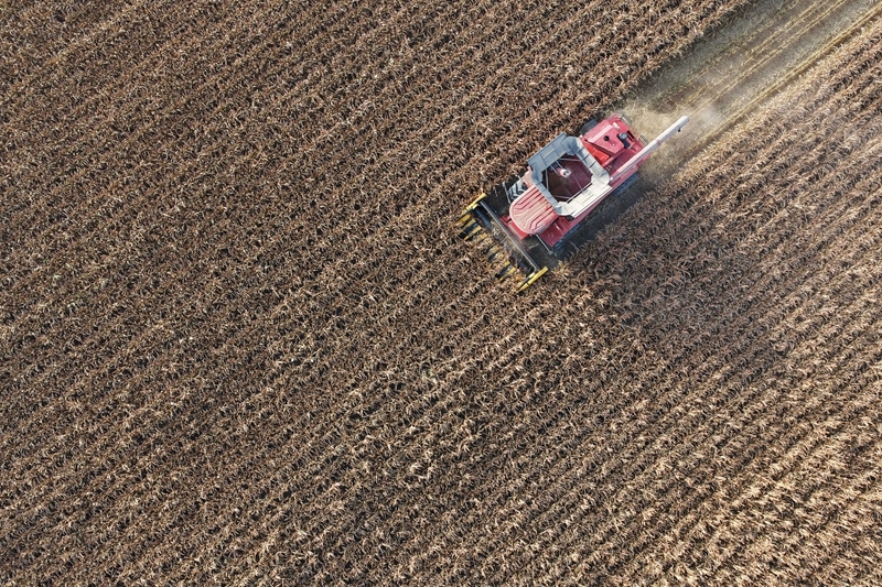 10月11日,在位于黑龍江省肇東市的北大荒集團四方山農(nóng)場有限公司,機械設備在進行玉米收獲作業(yè)(無人機照片)。