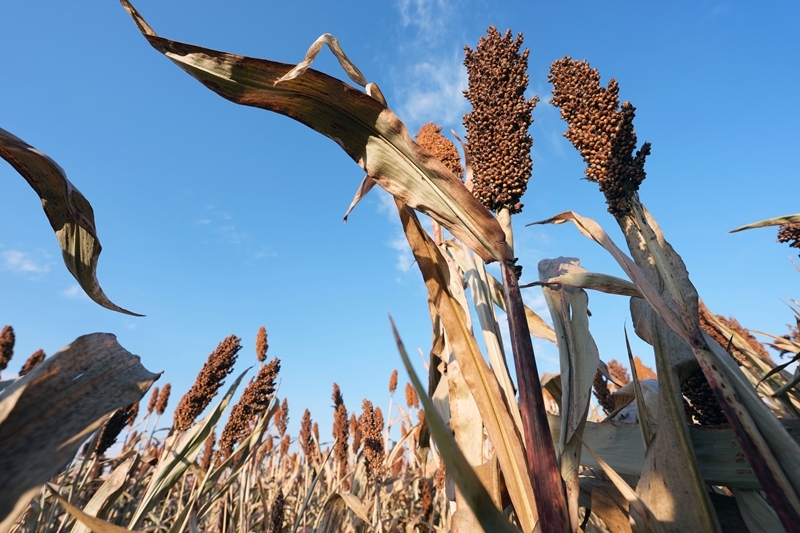 10月11日在位于黑龍江省肇東市的北大荒集團四方山農(nóng)場有限公司拍攝的耕地里成熟的高粱。