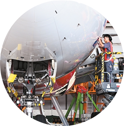 工作人員在海南自貿(mào)港一站式飛機(jī)維修產(chǎn)業(yè)基地檢修飛機(jī)。新華社記者 楊冠宇攝