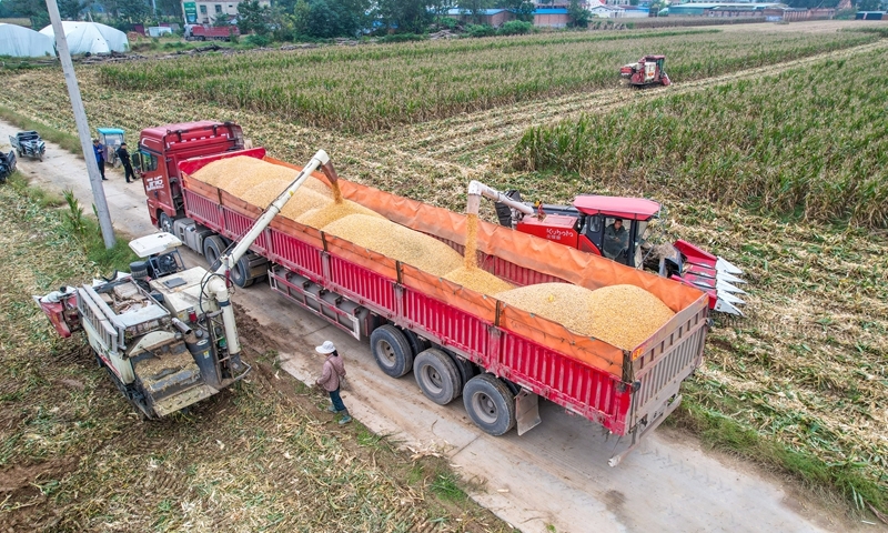 10月14日,在河南省商丘市夏邑縣會(huì)亭鎮(zhèn),收割機(jī)將收獲的玉米裝車(無人機(jī)照片)。