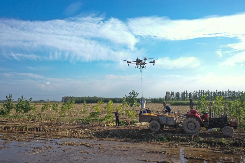 10月13日,山東省鄒平市九戶鎮(zhèn)農(nóng)民利用無人機(jī)在田間吊運(yùn)收獲的玉米(無人機(jī)照片)。