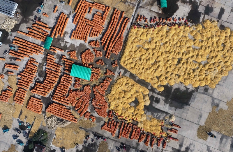 10月14日,在山東省聊城市茌平區(qū)肖家莊鎮(zhèn),村民將晾曬的玉米裝袋儲存(無人機(jī)照片)。