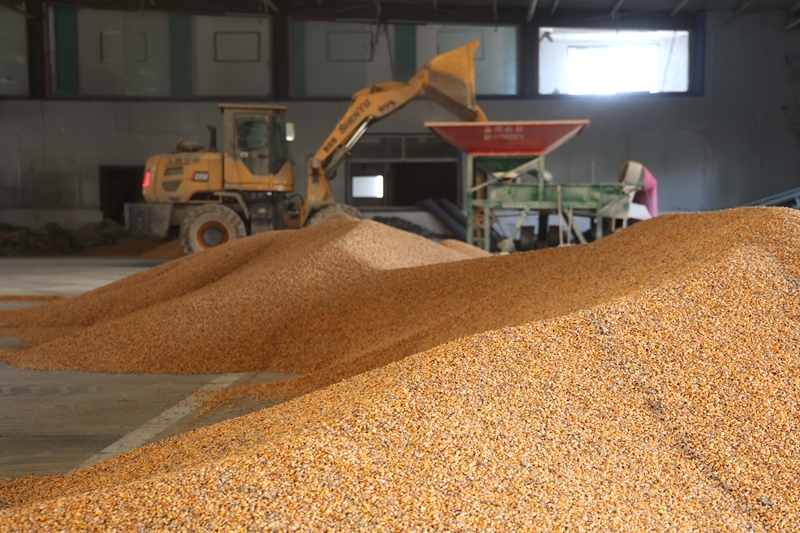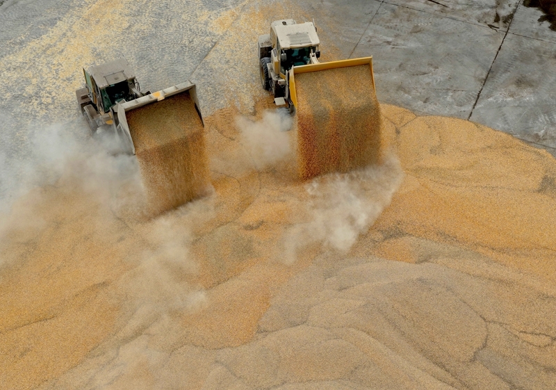 10月14日,在山東省濱州市高新區(qū)小營街道一處糧食加工點(diǎn),工作人員駕駛機(jī)械搬運(yùn)玉米。