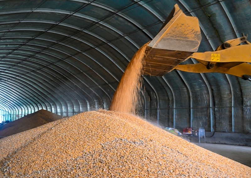 10月13日,在河南省商丘市夏邑縣會(huì)亭鎮(zhèn)一處糧食烘干點(diǎn),工人將烘干好的玉米入庫存放。