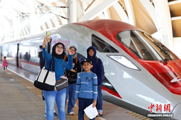 當?shù)貢r間6月26日,旅客在印尼雅加達哈利姆高鐵站與列車合影。雅萬高鐵由中印尼兩國合作建設,最高運營時速350公里?!?/span>中新社記者 李志全 攝