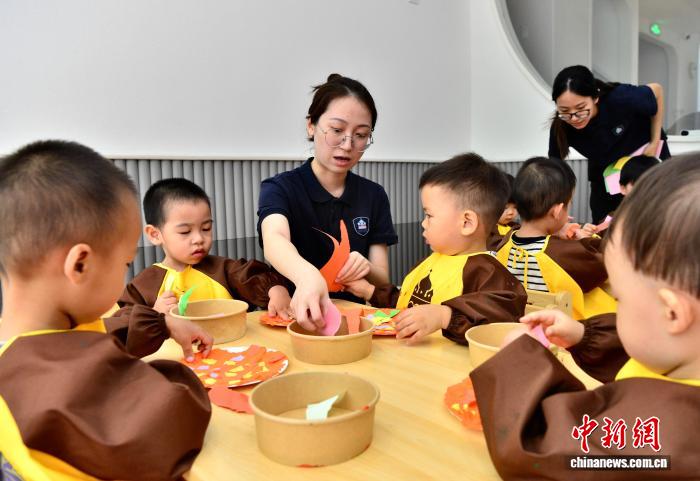 7月29日,福州新星托育園東街園老師指導(dǎo)小朋友進行藝術(shù)創(chuàng)想,制作美味的“披薩”。近年來,當(dāng)?shù)胤e極推動公辦幼兒園和社會力量興辦發(fā)展托育教育服務(wù),以解決民眾“帶娃難”的問題?!≈行律缬浾?張斌 攝