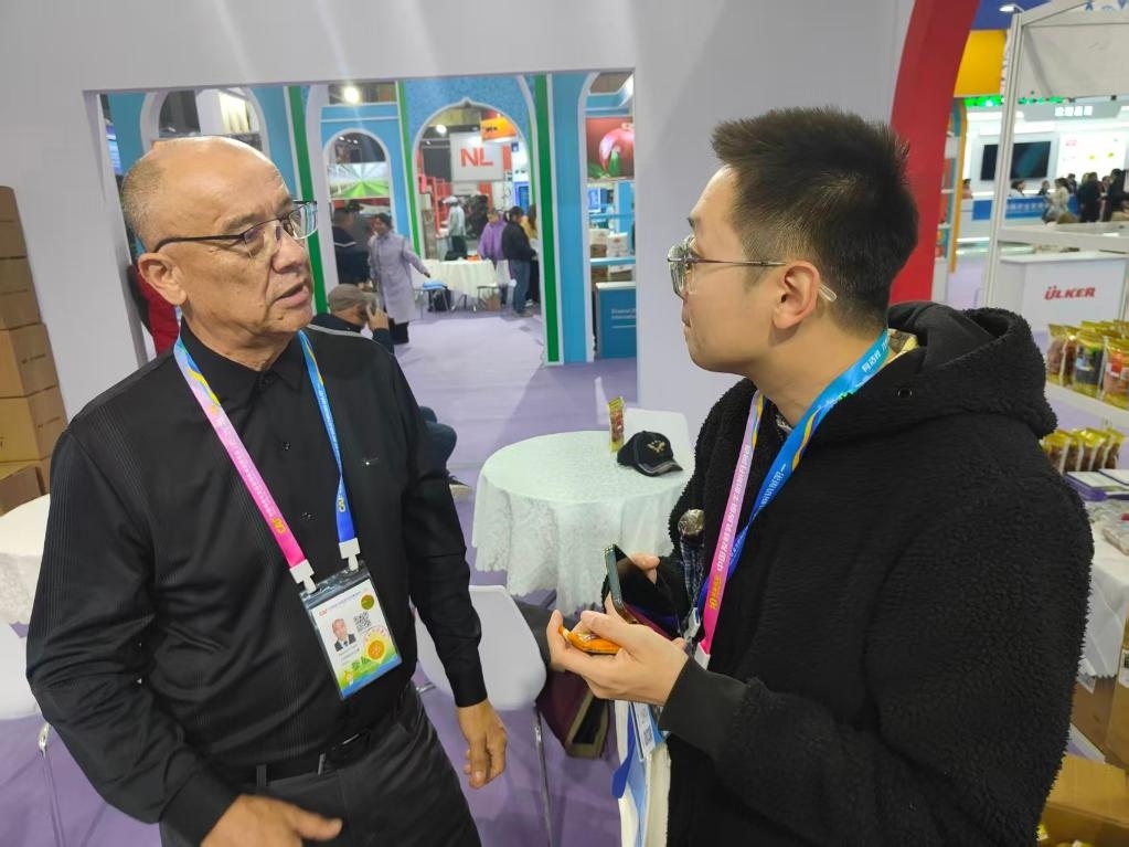 2025年10月24日,塔吉克斯坦杏和公司負(fù)責(zé)人普洛特·阿舒羅夫(左)介紹自己參加第32屆中國(guó)楊凌農(nóng)業(yè)高新科技成果博覽會(huì)的相關(guān)情況。新華社記者 姚友明 攝