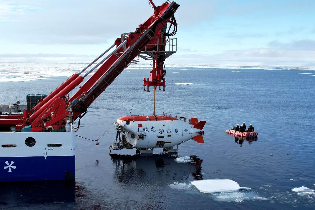 “蛟龍”號在北極冰區(qū)進行下潛。新華社記者劉詩平 攝