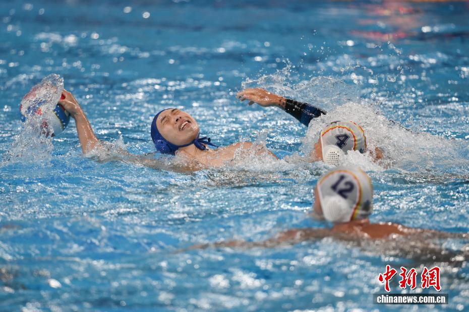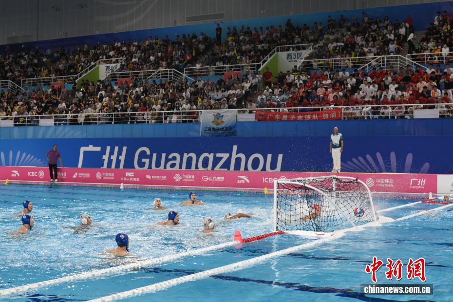 10月27日晚,在廣東廣州舉行的第十五屆全國運(yùn)動(dòng)會(huì)水球男子組比賽金牌賽中,廣東隊(duì)以16比9戰(zhàn)勝上海隊(duì),獲得金牌。圖為上海隊(duì)11號(hào)運(yùn)動(dòng)員蔡宇浩(白帽)在比賽中進(jìn)攻。