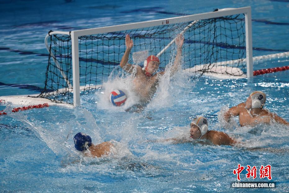 10月27日晚,在廣東廣州舉行的第十五屆全國運(yùn)動(dòng)會(huì)水球男子組比賽金牌賽中,廣東隊(duì)以16比9戰(zhàn)勝上海隊(duì),獲得金牌。圖為廣東隊(duì)運(yùn)動(dòng)員解澤楷(藍(lán)帽)在比賽中進(jìn)攻。