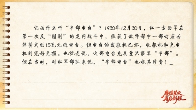 它為什么叫“半部電臺(tái)”?1930年12月30日,紅一方面軍在第一次反“圍剿”的龍岡戰(zhàn)斗中,繳獲了敵師部中一部燈座為彈簧式的15瓦無線電臺(tái)。但電臺(tái)的發(fā)報(bào)機(jī)已壞,收?qǐng)?bào)機(jī)和充電機(jī)則完好無損。也就是說,這部電臺(tái)充其量只能算“半部”。但在當(dāng)時(shí),對(duì)紅軍部隊(duì)來說,“半部電臺(tái)”也極其珍貴!