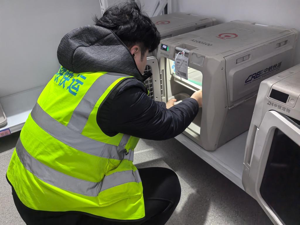 中鐵快運太原南站營業(yè)部業(yè)務(wù)負責人武鑫介紹:“我們自今年10月啟動高鐵寵物托運服務(wù)試點以來,已經(jīng)托運過寵物貓、寵物狗等。旅客可以在12306官方平臺或到營業(yè)部現(xiàn)場辦理托運業(yè)務(wù)。托運前,需要提交相關(guān)部門的檢疫證明。工作人員會對寵物運輸箱和列車環(huán)境進行嚴格消毒。寵物運輸箱內(nèi)還帶有攝像頭,主人可以通過監(jiān)控查看自家寵物的實時狀態(tài)。我們配備的工作人員,也會定時檢查寵物狀態(tài),提供必要的安撫和飲水。”