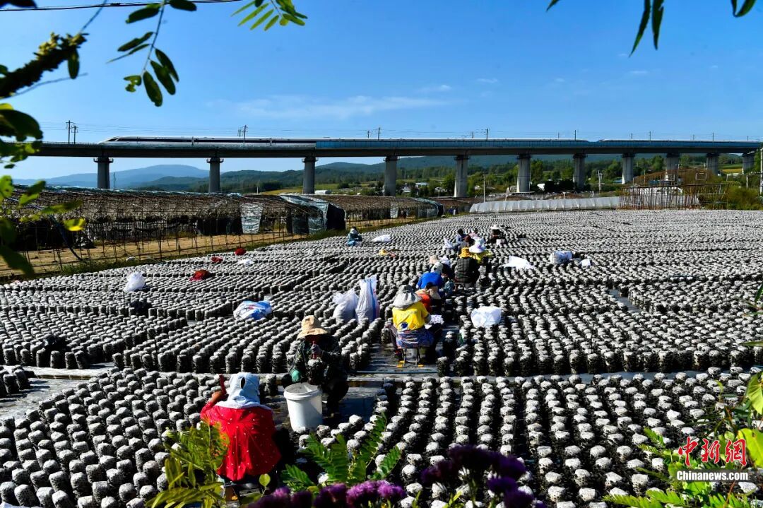(菌農(nóng)們有序采摘。黃松甸鎮(zhèn)供圖)