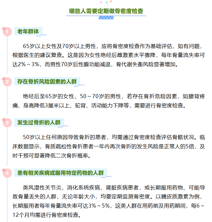 骨骼健康是人體健康的重要組成部分,其評估指標不僅包括鈣含量,還涉及骨骼強度等多方面的因素,而骨密度在一定程度上,可以反映骨骼健康狀態(tài)。需要明確的是,并非人人都需要進行骨密度檢查。而且,當下流行的體脂秤及體檢中常用的超聲骨密度檢查,均不能作為診斷骨質(zhì)疏松癥的依據(jù)。正確認識骨密度檢查的適用人群,既能避免醫(yī)療資源浪費,也能減少不必要的健康焦慮。