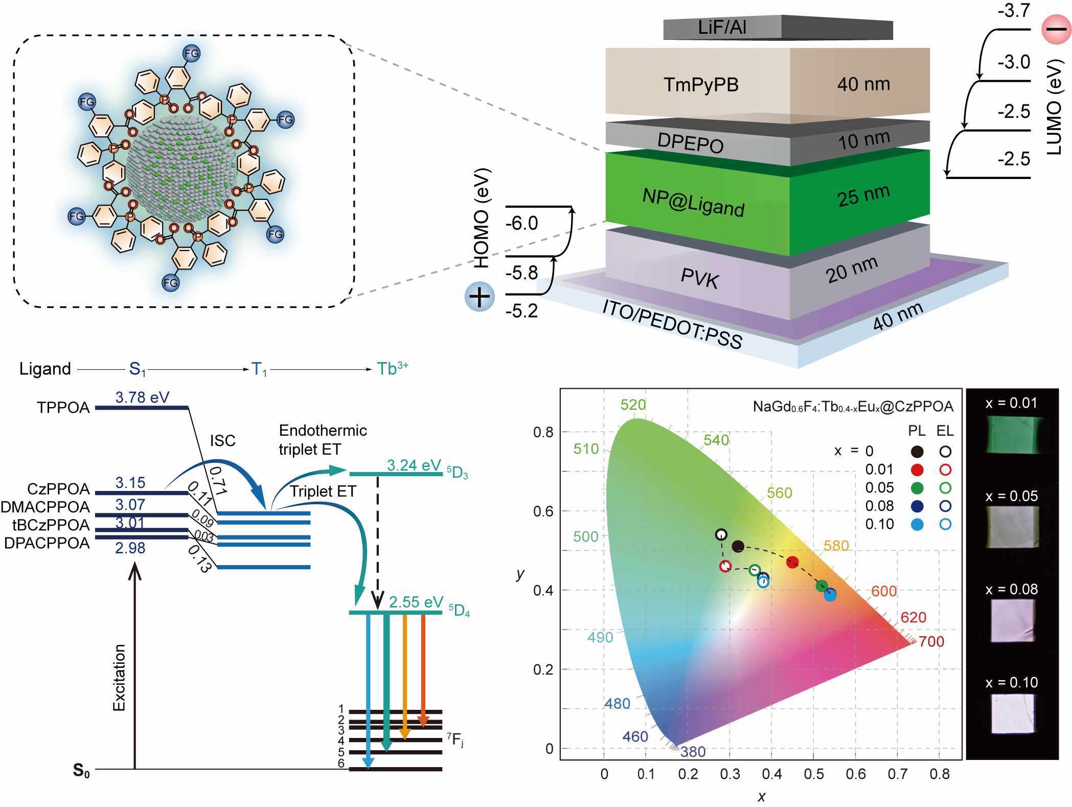 面對(duì)這一制約稀土材料邁向高端應(yīng)用的瓶頸,研究團(tuán)隊(duì)開(kāi)創(chuàng)性地提出有機(jī)半導(dǎo)體敏化策略,以功能化有機(jī)配體作為“光電橋梁”,成功將能量精準(zhǔn)高效地傳遞給絕緣稀土納米晶,實(shí)現(xiàn)了電流驅(qū)動(dòng)下的高效發(fā)光。