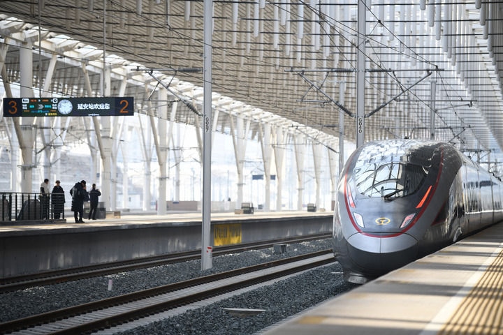 冬日暖陽,灑向延安火車站的站臺。26日10時許,“復(fù)興號”智能動車組列車駛出站臺,向著關(guān)中平原飛馳而去,縈繞在老區(qū)幾代人心中的高鐵夢照進(jìn)現(xiàn)實。