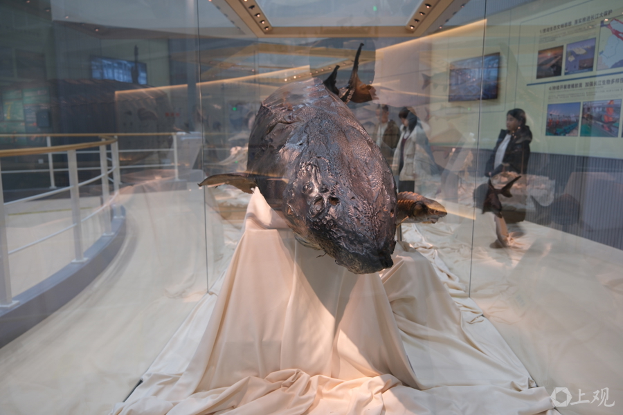 水野中心內(nèi)科普館的“鎮(zhèn)館之寶”,是一尾中華鱘標(biāo)本。它長(zhǎng)3.5米,重350公斤。2007年7月17日在金山區(qū)杭州灣水域誤入漁網(wǎng)受傷,經(jīng)全力救治成功存活1232天,在2010年12月1日死亡,創(chuàng)下當(dāng)時(shí)國(guó)內(nèi)搶救救治中華鱘最長(zhǎng)存活紀(jì)錄 郜陽 攝