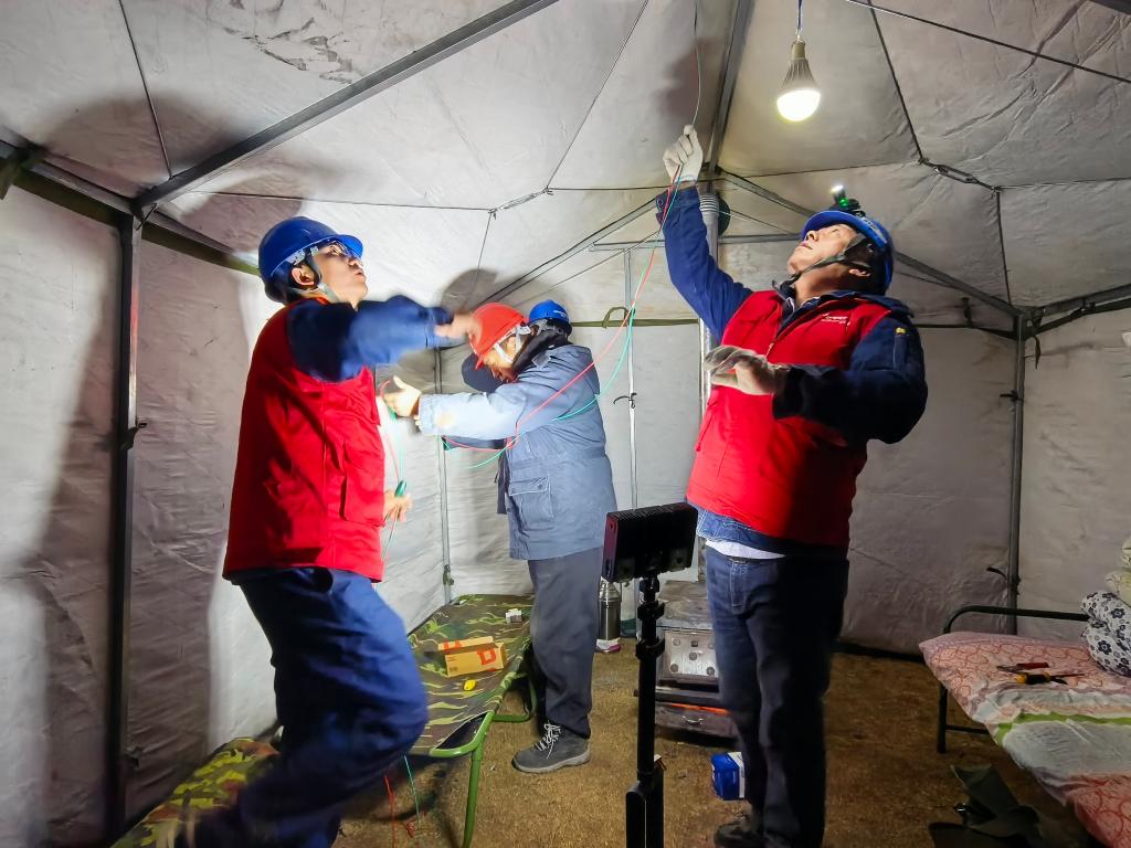 1月26日晚,國網(wǎng)甘南供電公司工作人員為臨時安置點(diǎn)應(yīng)急帳篷接電。(國網(wǎng)甘南供電公司供圖)