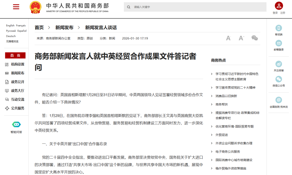 中國網(wǎng)1月30日訊 據(jù)商務部網(wǎng)站消息,商務部新聞發(fā)言人就中英經(jīng)貿合作成果文件答記者問。