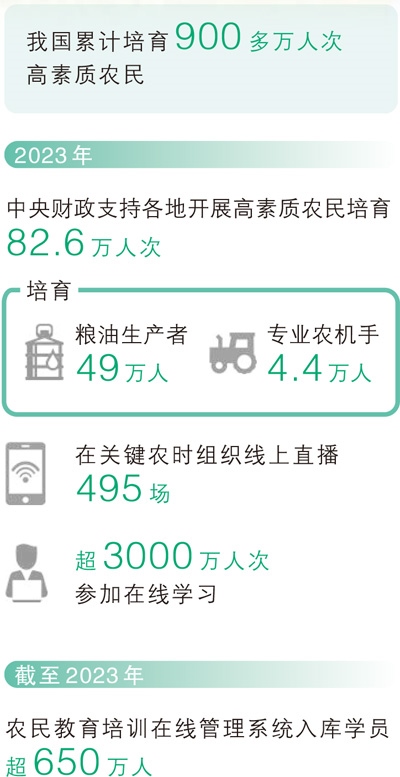 目前,我國(guó)累計(jì)培育900多萬(wàn)人次高素質(zhì)農(nóng)民。嘗鮮新技術(shù)、涉足新業(yè)態(tài),一批批高素質(zhì)農(nóng)民積極擁抱專業(yè)化、規(guī)?;?biāo)準(zhǔn)化的現(xiàn)代經(jīng)營(yíng)理念,為農(nóng)業(yè)農(nóng)村發(fā)展保持穩(wěn)中向好態(tài)勢(shì)提供了有力支撐。