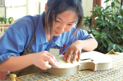 走進(jìn)華東樂器有限公司的生產(chǎn)車間,修弦枕、磨弦槽、打琴軸、上音柱、修琴碼……一道道工序正有條不紊地推進(jìn),35歲的郭增慧正熟練地組裝提琴。“來這里之前,我就是一位普通的家庭主婦,干過很多份工作,音樂和提琴對(duì)我來說是很遙遠(yuǎn)的東西?!惫龌鄹锌?。十年前,她從河北張家口嫁到東高村鎮(zhèn)附近的三河市,靠著家里的幾畝田地,生活并不富裕。在朋友的介紹下來到提琴?gòu)S,廠里的工資可觀,按件計(jì)酬,時(shí)間機(jī)動(dòng)靈活,可以隨時(shí)照顧家庭。于是,她在這兒一干就是十幾年。