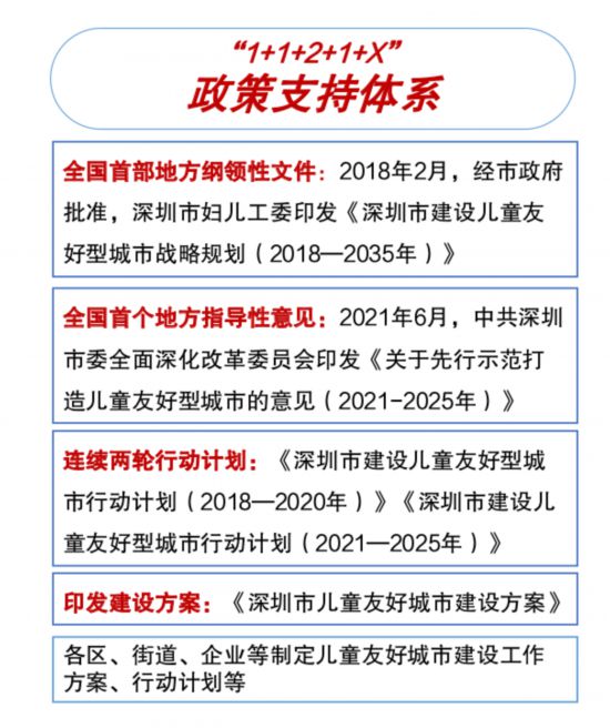 近年來,深圳在兒童友好城市建設(shè)上“放大招”!出臺兒童友好城市全國首部地方性行動綱領(lǐng)文件和首個地方指導性意見,實施兩輪五年行動計劃,制定建設(shè)方案,構(gòu)建“1+1+2+1+X”政策支持體系。