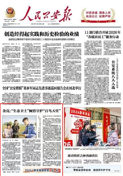 2026年1月25日《人民公安報》頭版刊發(fā)了《金亮:“生態(tài)衛(wèi)士”傾情守護“百鳥天堂”》的文章,報道了內蒙古扎賚特旗公安局圖牧吉國家級自然保護區(qū)森林公安派出所所長金亮的故事。作為一名當?shù)氐摹吧鷳B(tài)衛(wèi)士”,金亮與保護區(qū)相伴的24年,參與辦理治安案件2000余起、刑事案件400余起,查處違法犯罪嫌疑人2600余名。金亮用實際行動踐行著“守護好祖國北疆綠水青山”的偉大使命。