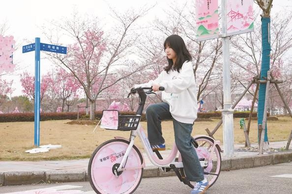 櫻花節(jié)期間,學校是禁止機動車入校的。校園大,游人累了怎么辦?上經(jīng)貿(mào)大學生食堂門口便出現(xiàn)了一道亮麗的風景線:那就是學校和“哈啰單車”聯(lián)名的粉色共享單車。50輛粉色的單車整齊排放在廣場上,車頭的粉色風車迎風轉(zhuǎn)動,櫻花節(jié)專屬IP“貿(mào)小櫻”人偶,揮舞著雙手邀請師生們前來騎行。聯(lián)名活動設計了賞櫻打卡點,游客可以騎著櫻花單車游覽校園,在3個最佳賞櫻點拍照打卡,體驗各處櫻花的詩情畫意。