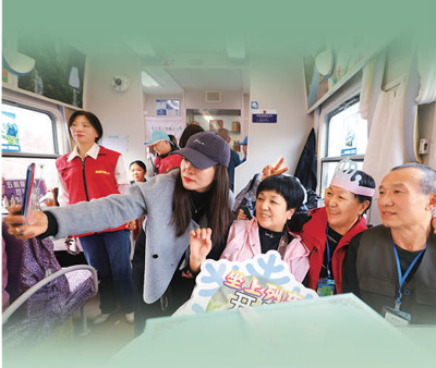 為讓銀發(fā)旅游更加精彩,銀發(fā)旅游列車不僅注重適老化改造,還通過特色主題表演,為老年游客帶來豐富的旅行體驗(yàn)。在Y471次熊貓旅游專列上,游客們可以欣賞到別具特色的川劇變臉。在黑龍江的冰雪旅拍主題旅游列車上,車廂內(nèi)融合哈爾濱各類景點(diǎn)進(jìn)行主題場景設(shè)計,老年游客只需掃碼預(yù)約便可換上不同風(fēng)格的服裝在車廂內(nèi)拍照打卡。列車上,老年游客不僅樂趣十足,還留下許多美好回憶。