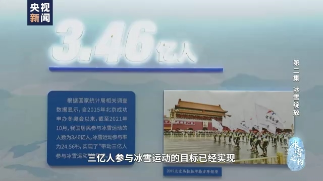 冰雪之約,中國(guó)之諾。八年前,中國(guó)許下了“三億人參與冰雪”的承諾;八年后,承諾已經(jīng)變?yōu)樯鷦?dòng)的現(xiàn)實(shí),中國(guó)冰雪運(yùn)動(dòng)大潮奔涌。大江南北,雪橇劃過;長(zhǎng)城內(nèi)外,冰刀飛舞;大河上下,雪車轟鳴。