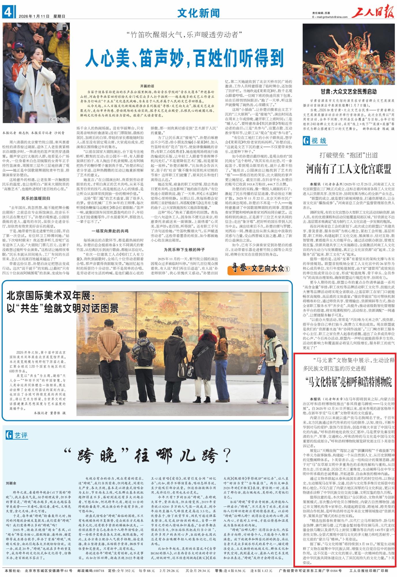 2026年1月11日,《工人日?qǐng)?bào)》第4版刊發(fā)了《“馬文化特展”亮相呼和浩特博物院》的文章,報(bào)道了馬年即將到來(lái)之際,呼和浩特博物院于2025年12月31日推出“春風(fēng)得意馬蹄疾——馬文化特展”,吸引眾多游客前來(lái)領(lǐng)略馬元素文物的文化魅力,展覽將持續(xù)至3月18日。