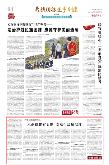 2025年9月23日,《中國民族報》第4版刊發(fā)題為《內(nèi)蒙古巴彥淖爾市:示范創(chuàng)建有力度 幸福生活加溫度》的文章,報道了2023年6月,習(xí)近平總書記在內(nèi)蒙古自治區(qū)考察調(diào)研時,首次提出“鑄牢中華民族共同體意識是新時代黨的民族工作的主線,也是民族地區(qū)各項工作的主線”。巴彥淖爾市始終牢記囑托,將“鑄牢”貫穿于想問題、作決策、干工作的全過程。