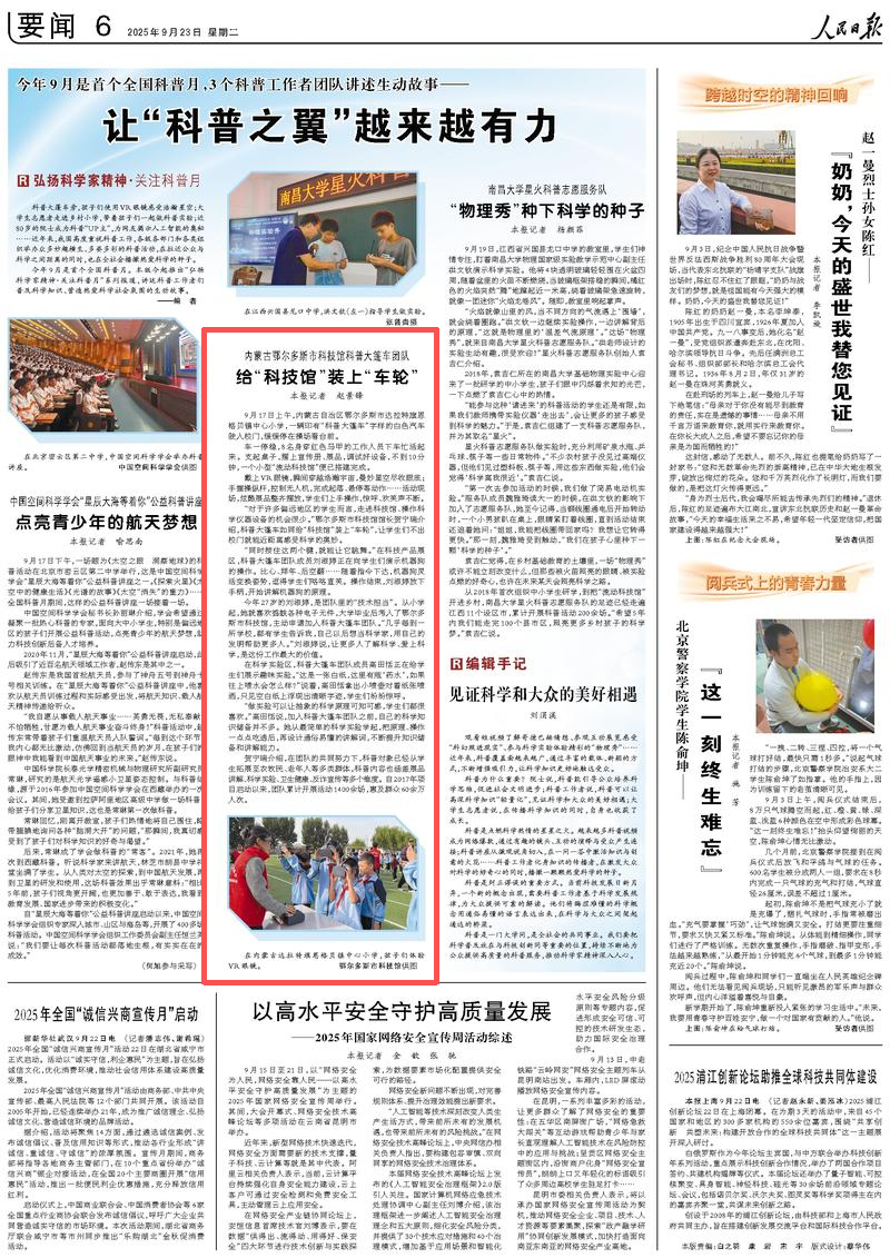2025年9月23日,《人民日?qǐng)?bào)》第6版刊發(fā)題為《內(nèi)蒙古鄂爾多斯市科技館科普大篷車團(tuán)隊(duì)給“科技館”裝上“車輪”》的文章,報(bào)道了內(nèi)蒙古自治區(qū)鄂爾多斯市,科普大篷車如同給“科技館”裝上“車輪”,讓學(xué)生們不出校門就能近距離感受科學(xué)的奧妙。