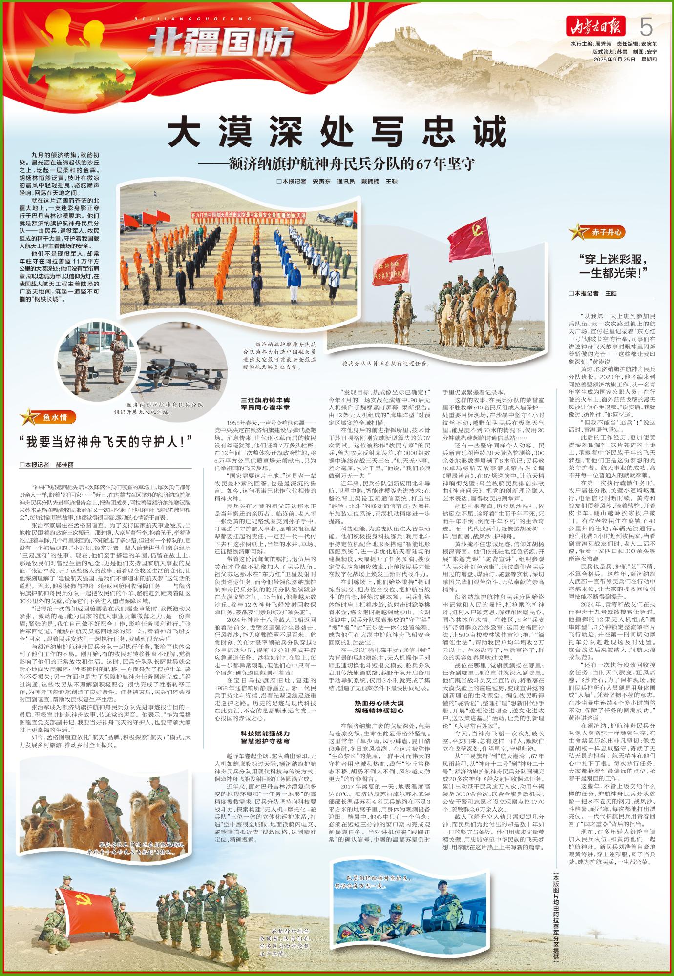 額濟(jì)納旗護(hù)航神舟民兵分隊(duì)始終牢記黨和人民的囑托,扛槍乘駝護(hù)神舟、進(jìn)村入戶頌黨恩、解難幫困暖民心、同心共沐魚(yú)水情。在牧區(qū),8名“兵支書(shū)”帶領(lǐng)群眾治沙致富:運(yùn)用方格固沙法,讓500畝梭梭林鎖住黃沙;推廣“滴灌催生法”,幫助牧民戶均年增收2萬(wàn)元以上。生態(tài)改善了,生活富裕了,群眾的笑容如春風(fēng)吹過(guò)戈壁。