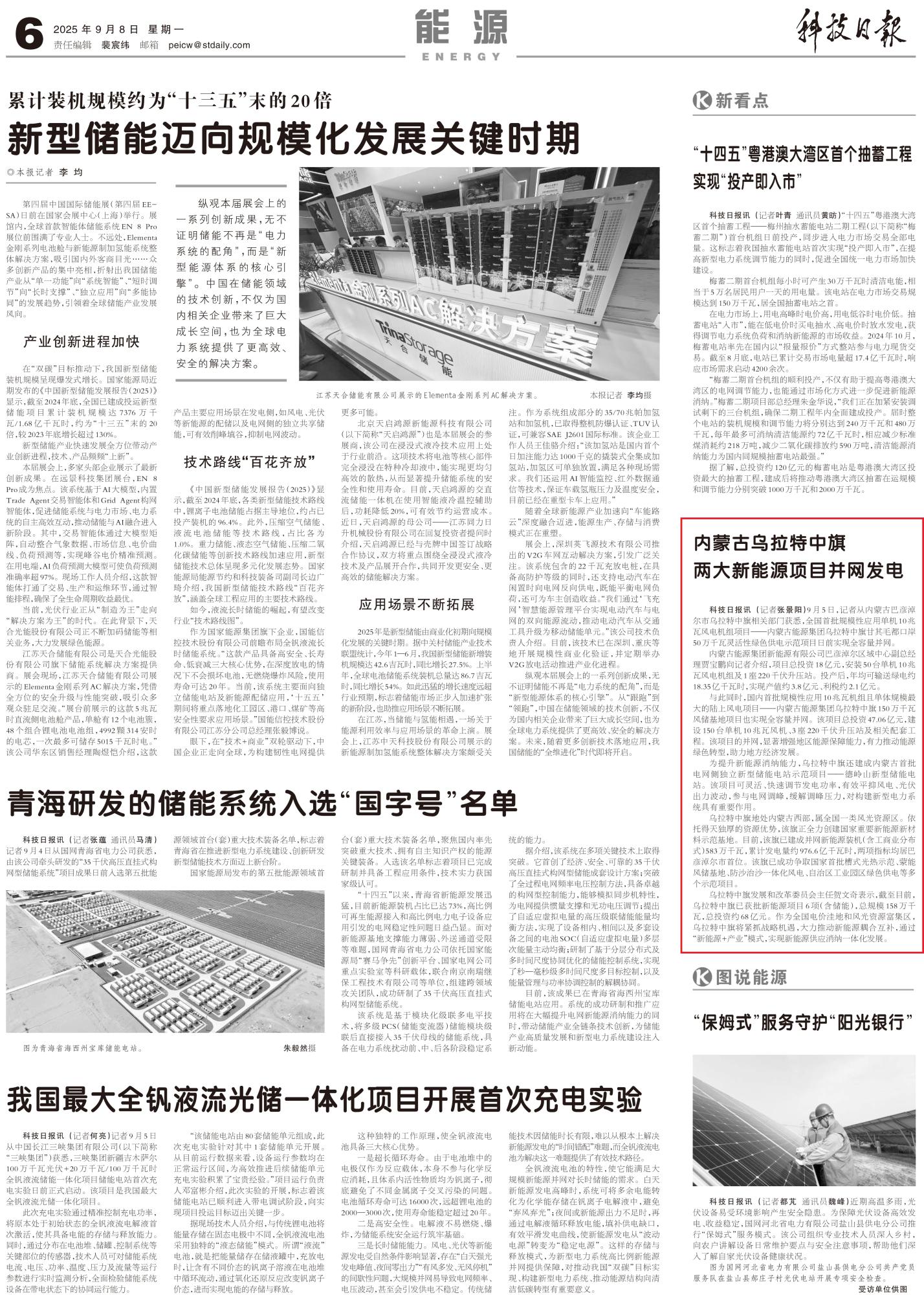 2025年9月8日,《科技日報》第6版整版刊發(fā)題為《內(nèi)蒙古烏拉特中旗兩大新能源項目并網(wǎng)發(fā)電》的文章,報道了記者從內(nèi)蒙古巴彥淖爾市烏拉特中旗相關部門獲悉,全國首批規(guī)模性應用單機10兆瓦風電機組項目——內(nèi)蒙古能源集團烏拉特中旗甘其毛都口岸50萬千瓦靈活性綠色供電示范項目日前實現(xiàn)全容量并網(wǎng)。