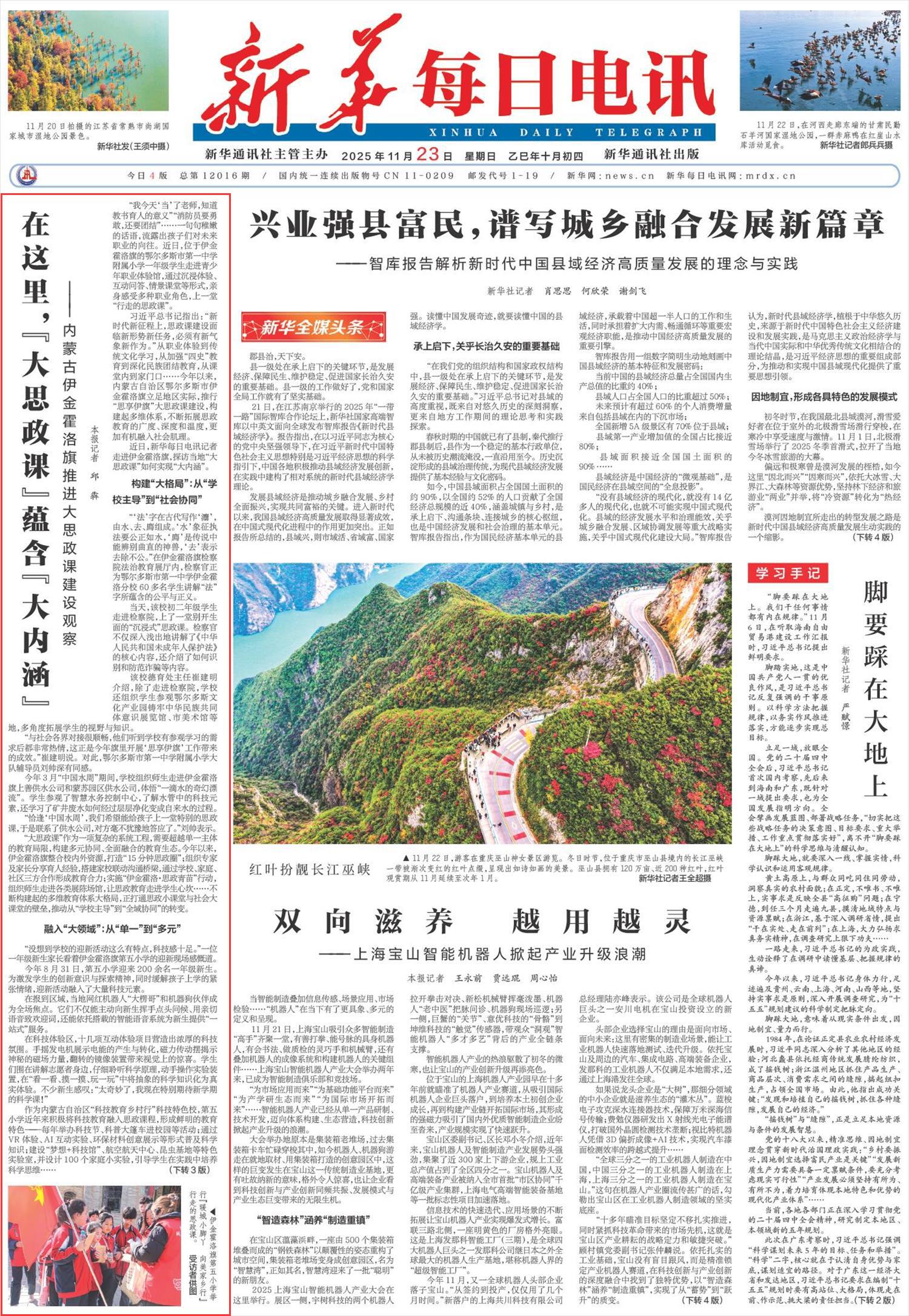 2025年11月23日,《新華每日電訊》頭版刊發(fā)題為《在這里,“大思政課”蘊(yùn)含“大內(nèi)涵”——內(nèi)蒙古伊金霍洛旗推進(jìn)大思政課建設(shè)觀(guān)察》的文章,報(bào)道了內(nèi)蒙古自治區(qū)鄂爾多斯市伊金霍洛旗立足地區(qū)實(shí)際,推行“思享伊旗”大思政課建設(shè),構(gòu)建起多維體系,不斷拓展思政教育的廣度、深度和溫度,更加有機(jī)融入社會(huì)肌理。