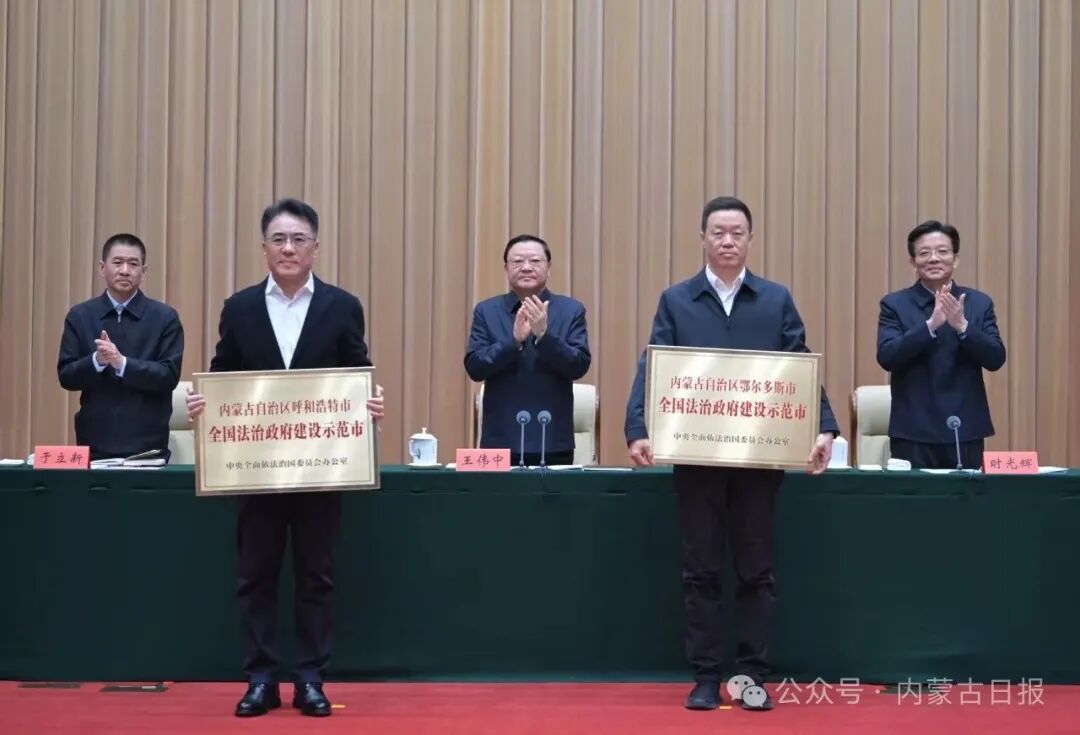 自治區(qū)黨委副書記、自治區(qū)黨委全面依法治區(qū)委員會副主任時光輝主持會議。自治區(qū)黨委、人大常委會、政府、政協(xié)有關領導同志和法檢“兩長”出席。會議為自治區(qū)獲評第三批全國法治政府建設示范地區(qū)的呼和浩特市、鄂爾多斯市授牌。