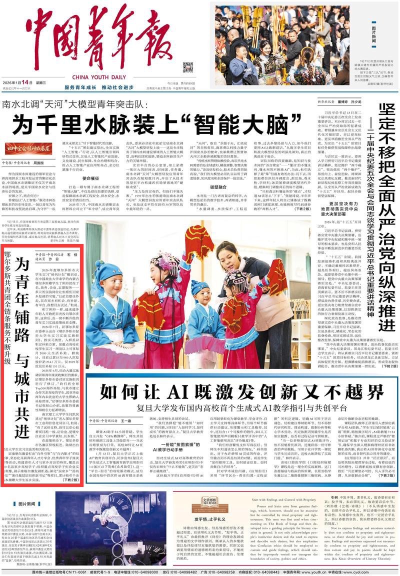 2026年1月14日,《中國青年報》頭版刊發(fā)題為《鄂爾多斯共青團全鏈條服務不斷升級 為青年鋪路 與城市共進》的文章,報道了2024年7月,團鄂爾多斯市委牽頭出臺《鄂爾多斯市促進大學生實習實踐實施細則》,按實習類型、人群差異制定補貼方案。2025年6月,結合大量實地調研和青年座談收集到的需求,團鄂爾多斯市委對該實施細則進行了修訂。在政策帶動下,鄂爾多斯市各旗區(qū)積極跟進,陸續(xù)出臺促進大學生實習實踐的相關細則。