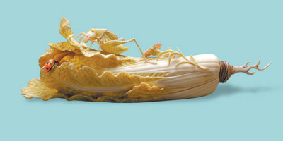 細(xì)細(xì)端詳,白菜葉莖上,還飾有兩朵小花,一朵含苞,一朵盛放;菜葉與主體的結(jié)合部位,趴伏著一只翠色蟈蟈,蟈蟈雙腿一屈一蹬,正盡情吮吸白菜鮮美的汁水;一只瓢蟲一旁靜臥,須角隱現(xiàn),似乎也在埋頭享用大餐。小花和小蟲的點綴,使得整個作品兼顧野趣和雅致,充滿生命的律動與自然的和諧。
